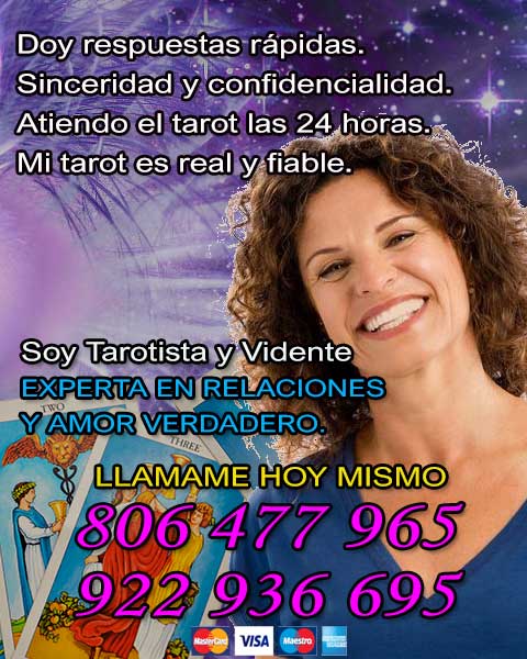 Cuando realizas tus preguntas al tarot económico telefónico por visa u 806 conmigo, lo primero que sucede es que mi Guía Espiritual contacta directamente contigo. Mi Videncia Natural al oír tu voz, empieza a trabajar para ti. Además de mi clarividencia, me ayudo del tarot para poder dar repuesta lo más certera posible y de la forma más rápida, concreta y honesta